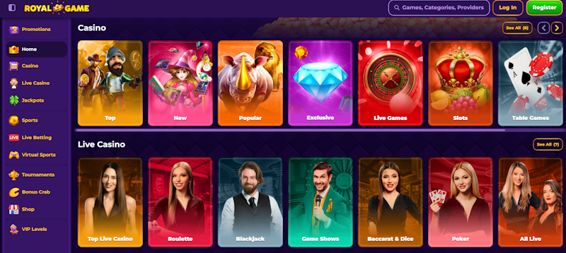Večina iger je na voljo tudi v demo različici, poganjajo pa jih priznani ponudniki, kot so Playtech, Live Games in Apollo. RoyalGame Casino se lahko pohvali tudi s stotinami miz z delivci v živo ter več kot 30 plačilnimi metodami, kar uporabnikom omogoča hiter začetek igranja.